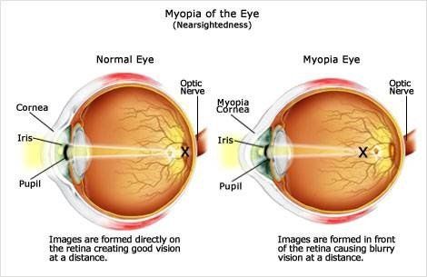 Nearsightedness, or myopia, is the ability to see things clearly up close, but with blurry vision at distance. Myopia occurs when the eye is too long, causing light rays entering the eye to focus in front of the retina, creating a blurry image. Nearsightedness affects 40% of Americans, and is correctable with glasses, contact lenses, LASIK, PRK, or refractive lens exchange.